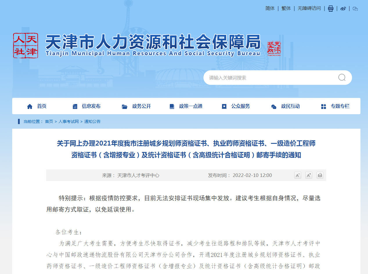 为满足广大考生需要,方便考生尽快取得证书,减少考生往返路程和排队等候,天津市人才考评中心与中国邮政速递物流股份有限公司天津市分公司合作,开通2021年度注册城乡规划师资格证书、执业药师资格证书、一级造价工程师资格证书(含增报专业)及统计资格证书(含高级统计合格证明)邮政EMS寄递业务。具体事项通知如下: