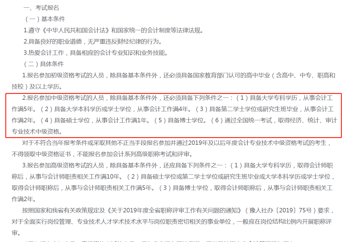 报名参加中级资格考试的人员,除具备基本条件外,还必须具备下列条件之一:(1)具备大学专科学历,从事会计工作满5年。(2)具备大学本科学历或学士学位,从事会计工作满4年。(3)具备第二学士学位或研究生班毕业,从事会计工作满2年。(4)具备硕士学位,从事会计工作满1年。(5)具备博士学位。(6)通过全国统一考试,取得经济、统计、审计专业技术中级资格。