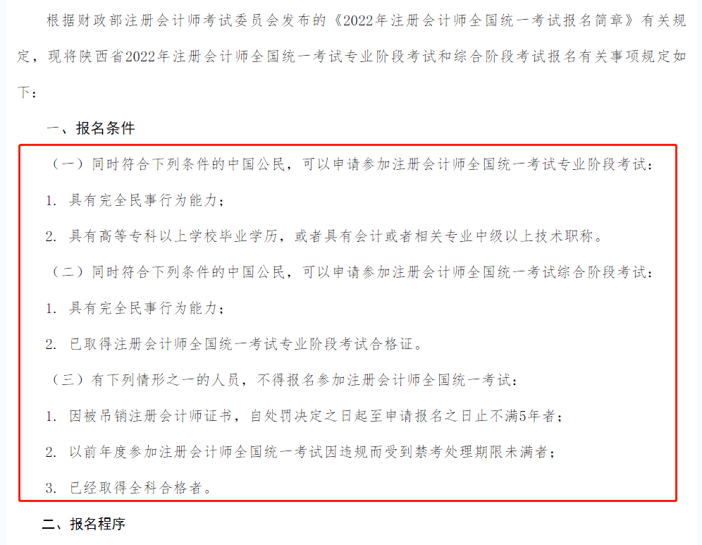 学注会要总结自己独特的时光,一天24小时,扣除6-8小时的睡眠时间,扣除8-10小时的工作或加班时间,剩下8小时。早上上班前,无论乘坐公交车、地铁还是自驾,基本上都可以听2个小时的课件,早上,思路比较清晰,适合阅读课件,你可以在中午的午休时间做一个小时的试题,当你晚上和孩子在一起时,你可以听两个小时的课件,在孩子睡着后,在晚上安静的时候开始做当天章节的试题,你必须每天留出4-5小时学习,只有这样坚持才能出效果。上考教育从陕西省注册会计师协会官网发布的报考通告得知,2022年陕西省注册会计师CPA报考条件主要有以下三项: