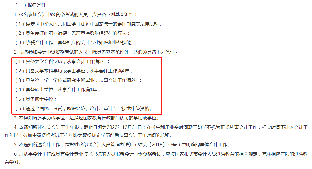 4. 本通知所述有关会计工作年限,截止日期为2022年12月31日;在校生利用业余时间勤工助学不视为正式从事会计工作,相应时间不计入会计工作年限;参加中级资格考试工作年限为取得规定学历前后从事会计工作时间的总和。