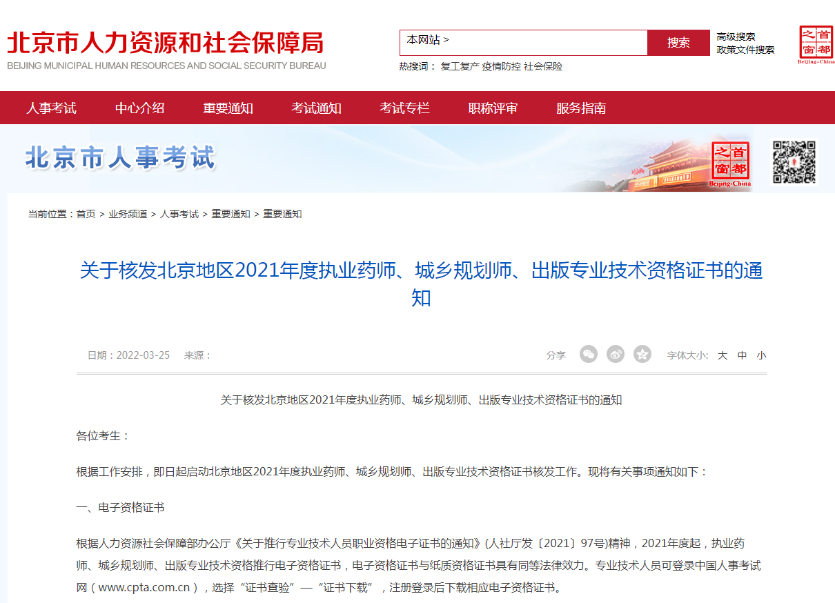 根据工作安排,即日2022年3月25日起启动北京地区2021年度执业药师、城乡规划师、出版专业技术资格证书核发工作。现将有关事项通知如下: