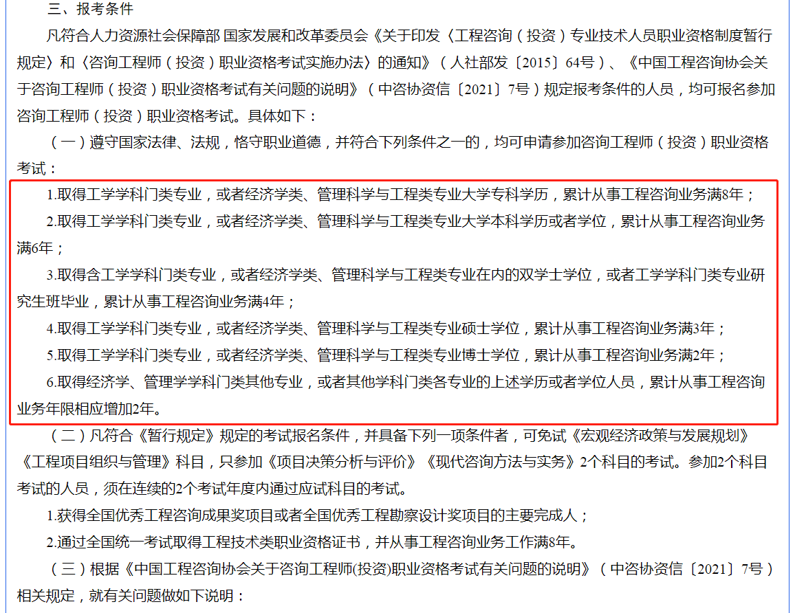 1.取得工学学科门类专业,或者经济学类、管理科学与工程类专业大学专科学历,累计从事工程咨询业务满8年;