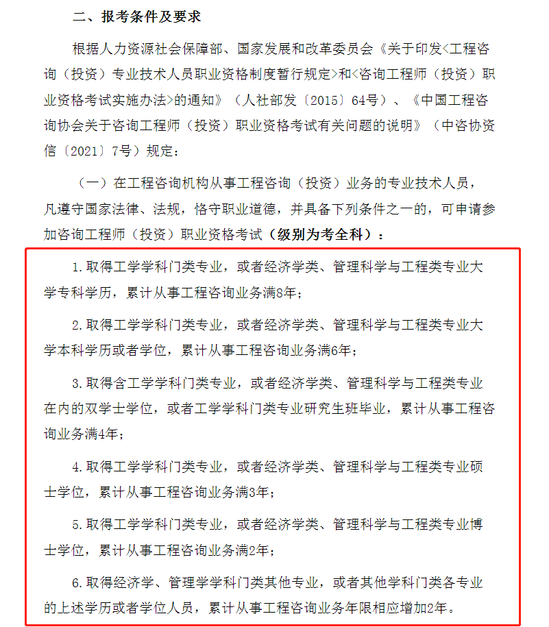 1.取得工学学科门类专业,或者经济学类、管理科学与工程类专业大学专科学历,累计从事工程咨询业务满8年;