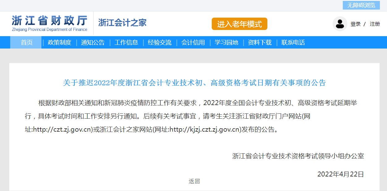 关于推迟2022年度浙江省会计专业技术初、高级资格考试日期有关事项的公告