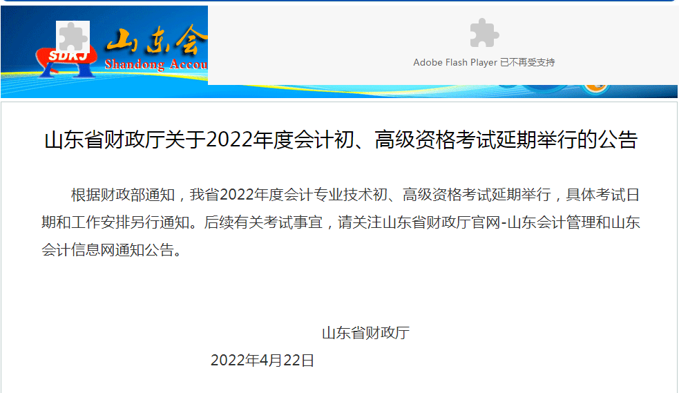 山东省财政厅关于2022年度会计初、高级资格考试延期举行的公告