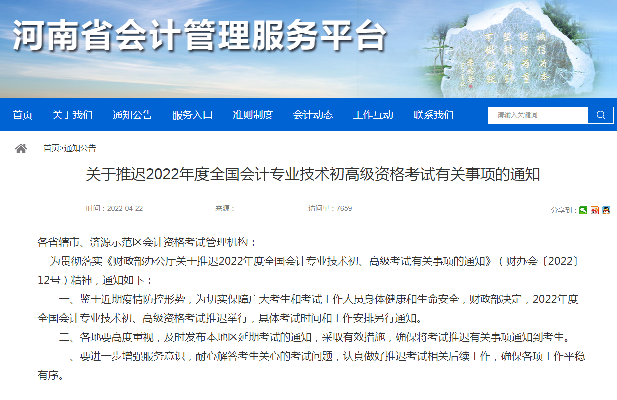 关于推迟2022年度河南省会计专业技术初高级资格考试有关事项的通知