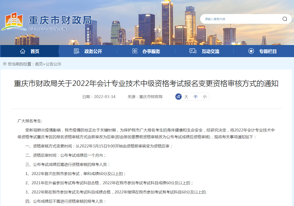 重庆市财政局关于2022年会计专业技术中级资格考试报名变更资格审核方式的通知