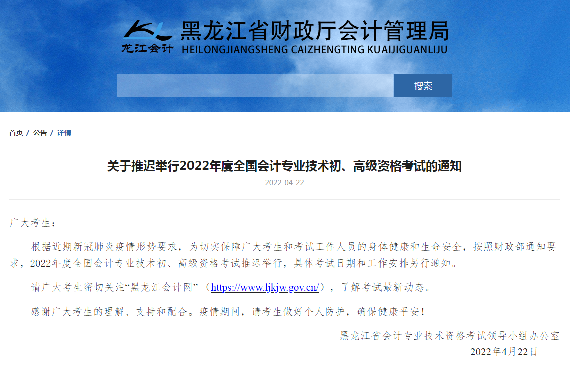 根据近期新冠肺炎疫情形势要求,为切实保障广大考生和考试工作人员的身体健康和生命安全,按照财政部通知要求,2022年度全国会计专业技术初、高级资格考试推迟举行,具体考试日期和工作安排另行通知。
