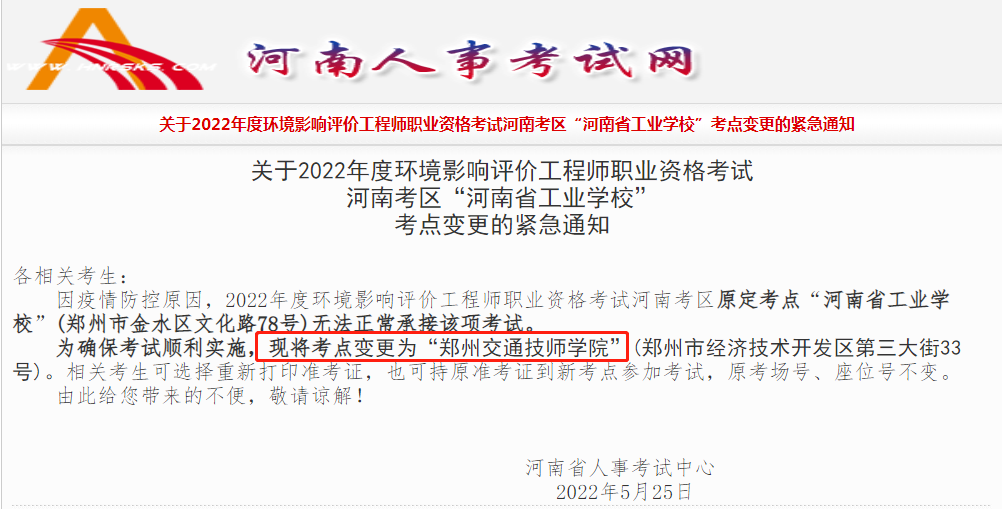 因疫情防控原因,2022年度环境影响评价工程师职业资格考试河南考区原定考点“河南省工业学校”(郑州市金水区文化路78号)无法正常承接该项考试。