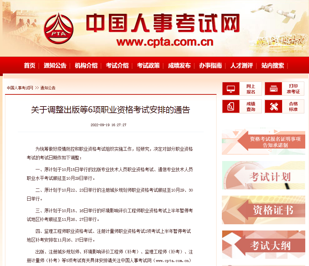 一、原计划于10月15日举行的出版专业技术人员职业资格考试、通信专业技术人员职业水平考试顺延至10月29日举行。