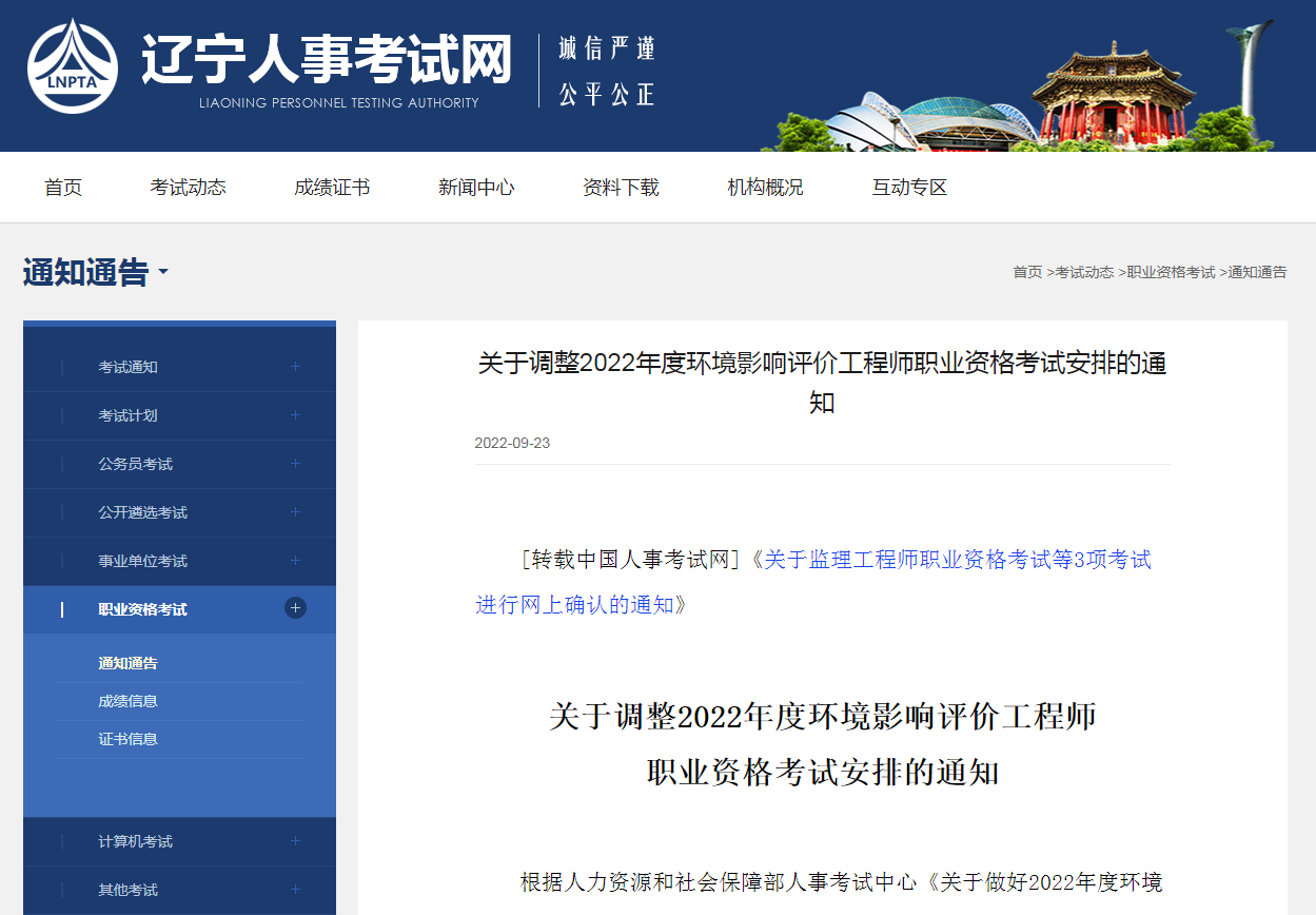 辽宁根据人力资源和社会保障部人事考试中心《关于做好2022年度环境影响评价工程师职业资格考试暂停考试地区补考考务工作的通知》(人考中心函〔2022〕64号),2022年度环境影响评价工程师职业资格考试调整至11月26、27日举行。现将有关事项通知如下: