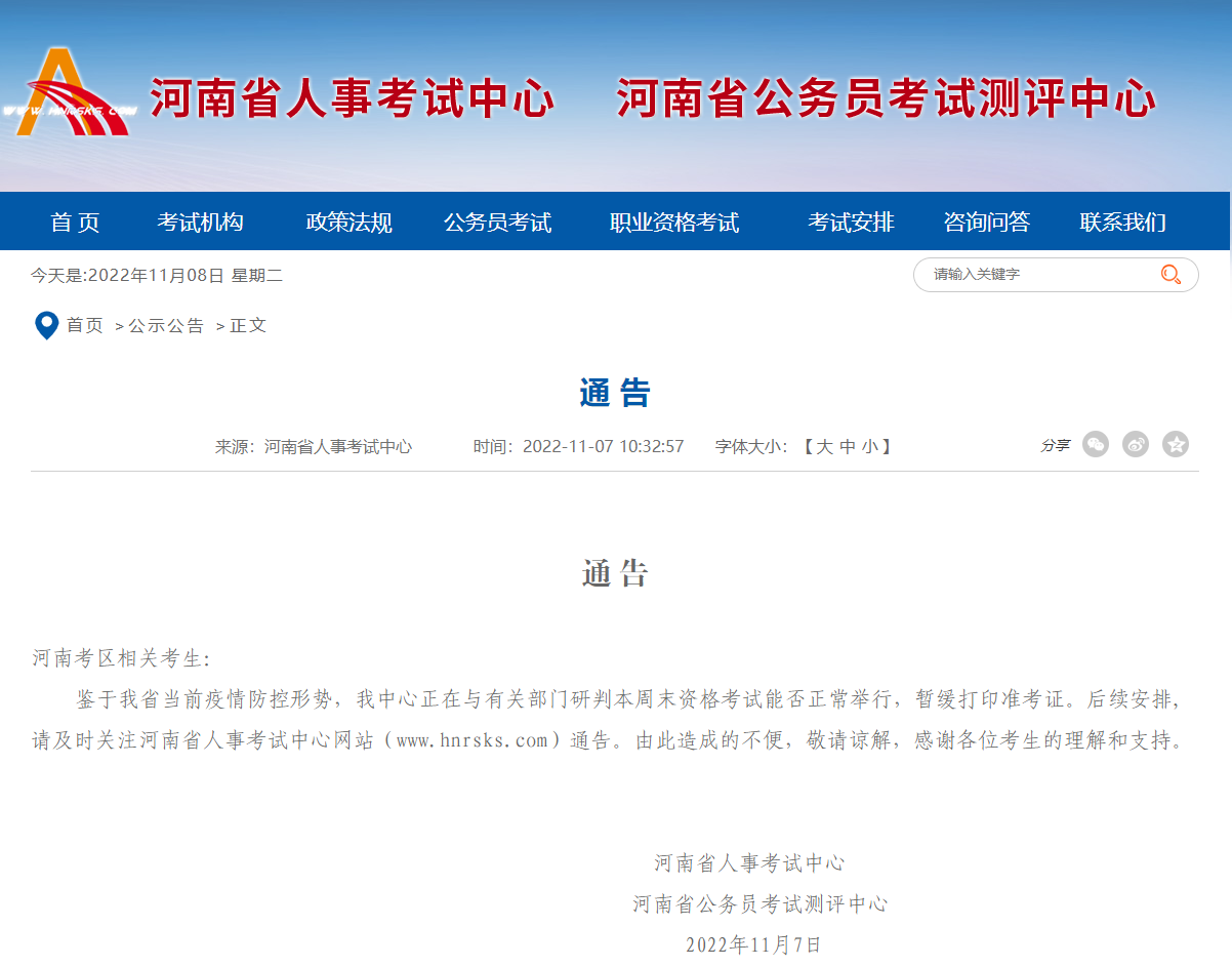 鉴于我省当前疫情防控形势,我中心正在与有关部门研判本周末资格考试能否正常举行,暂缓打印准考证。后续安排,请及时关注河南省人事考试中心网站(www.hnrsks.com)通告。由此造成的不便,敬请谅解,感谢各位考生的理解和支持。