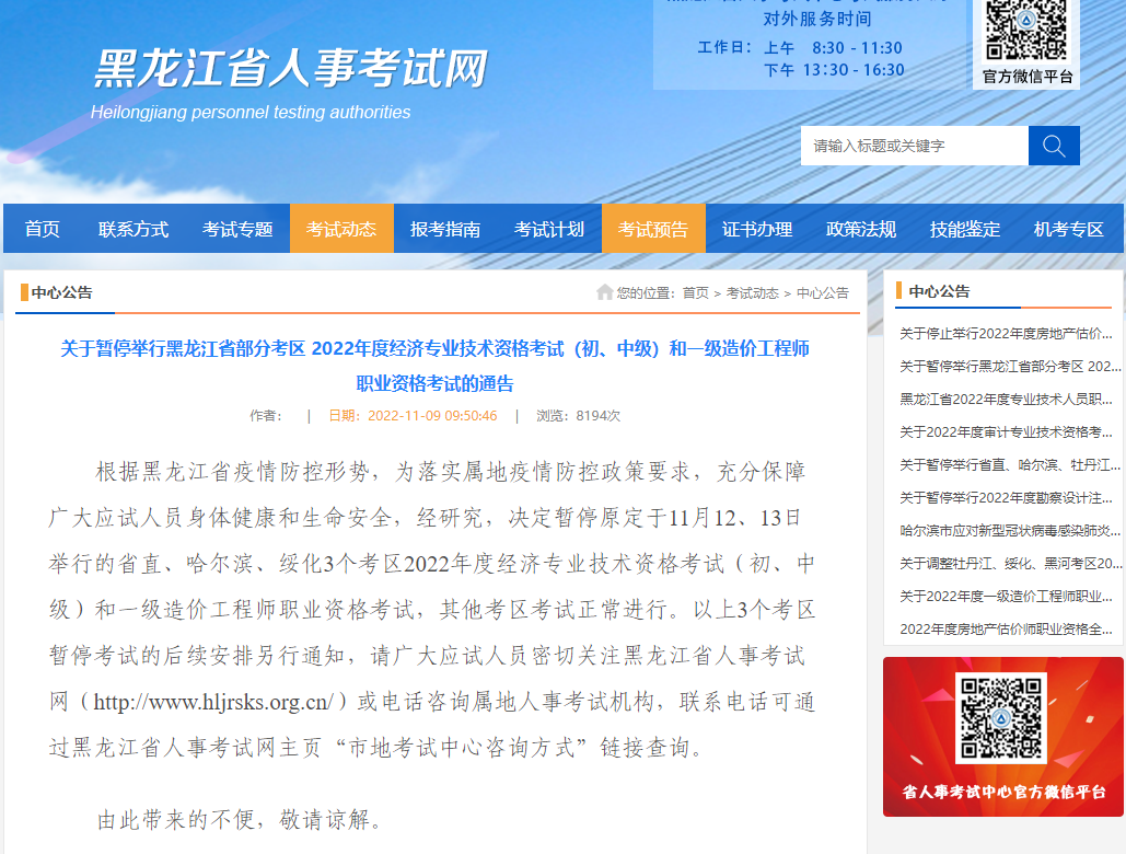 根据黑龙江省疫情防控形势,为落实属地疫情防控政策要求,充分保障广大应试人员身体健康和生命安全,经研究,决定暂停原定于11月12、13日举行的省直、哈尔滨、绥化3个考区2022年度经济专业技术资格考试(初、中级)和一级造价工程师职业资格考试,其他考区考试正常进行。以上3个考区暂停考试的后续安排另行通知,请广大应试人员密切关注黑龙江省人事考试网(http://www.hljrsks.org.cn/)或电话咨询属地人事考试机构,联系电话可通过黑龙江省人事考试网主页“市地考试中心咨询方式”链接查询。