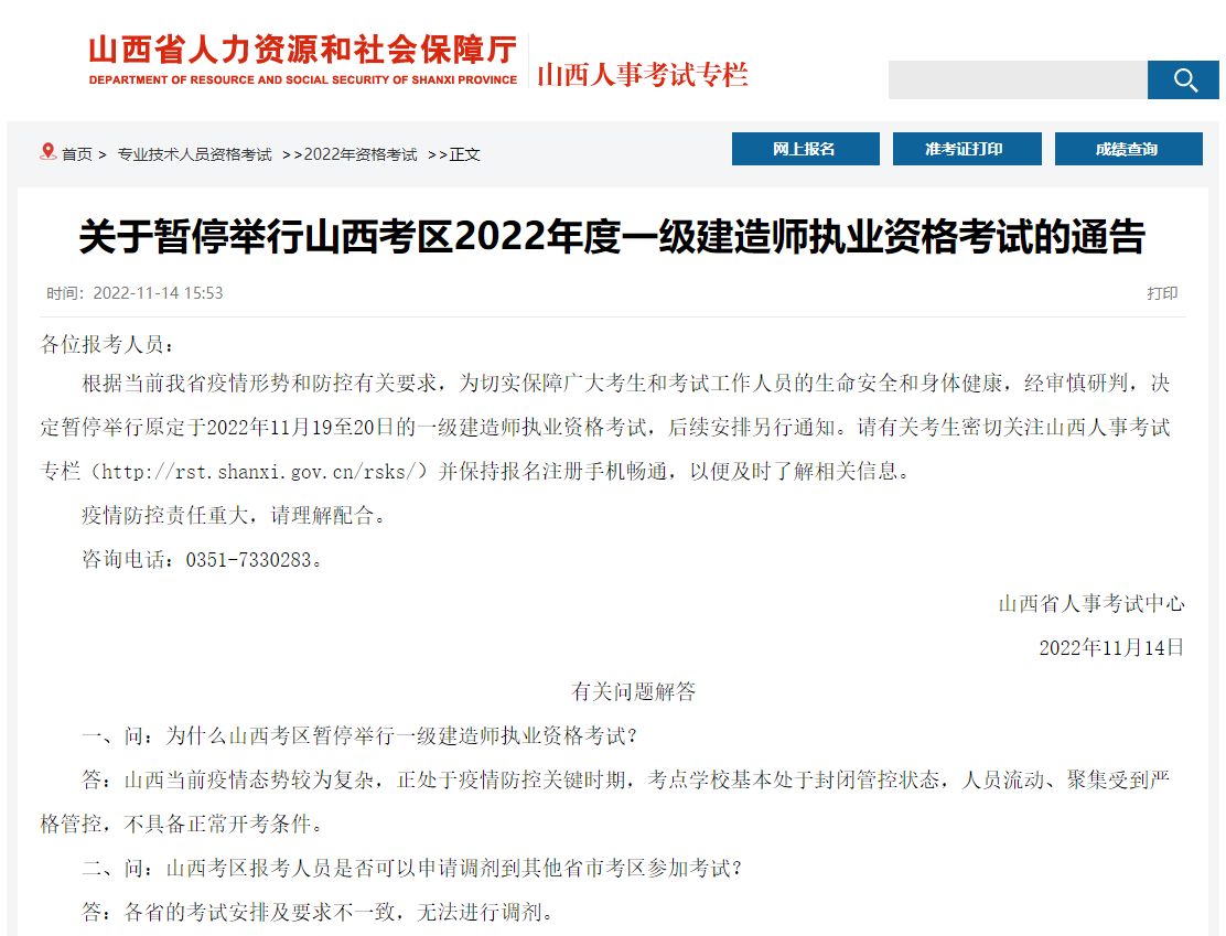 根据当前我省疫情形势和防控有关要求,为切实保障广大考生和考试工作人员的生命安全和身体健康,经审慎研判,决定暂停举行原定于2022年11月19至20日的一级建造师执业资格考试,后续安排另行通知。请有关考生密切关注山西人事考试专栏(http://rst.shanxi.gov.cn/rsks/)并保持报名注册手机畅通,以便及时了解相关信息。