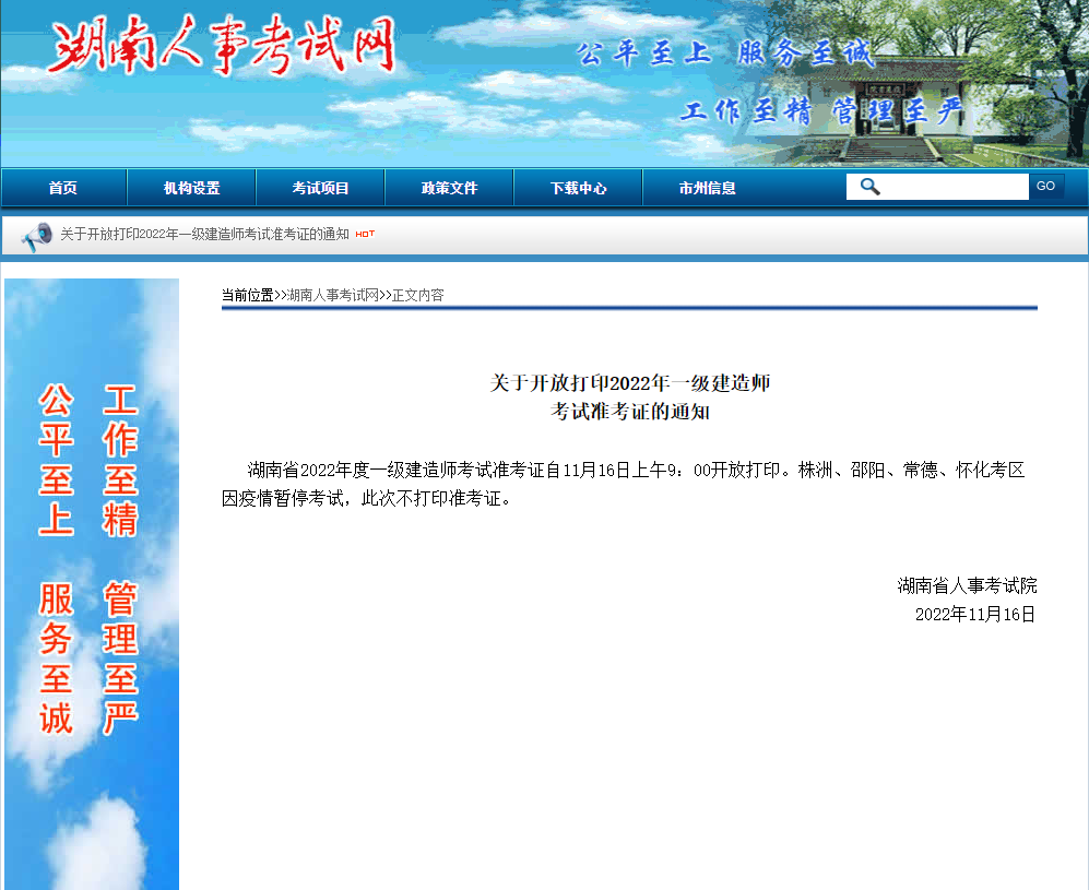 湖南省2022年度一级建造师考试准考证自11月16日上午9:00开放打印。株洲、邵阳、常德、怀化考区因疫情暂停考试,此次不打印准考证。