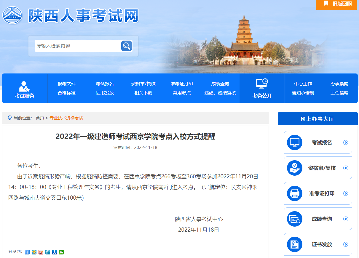 由于近期疫情形势严峻,根据疫情防控需要,在西京学院考点266考场至360考场参加2022年11月20日14:00-18:00《专业工程管理与实务》的考生,请从西京学院南2门进入考点。(导航定位:长安区神禾四路与城南大道交叉口东100米)