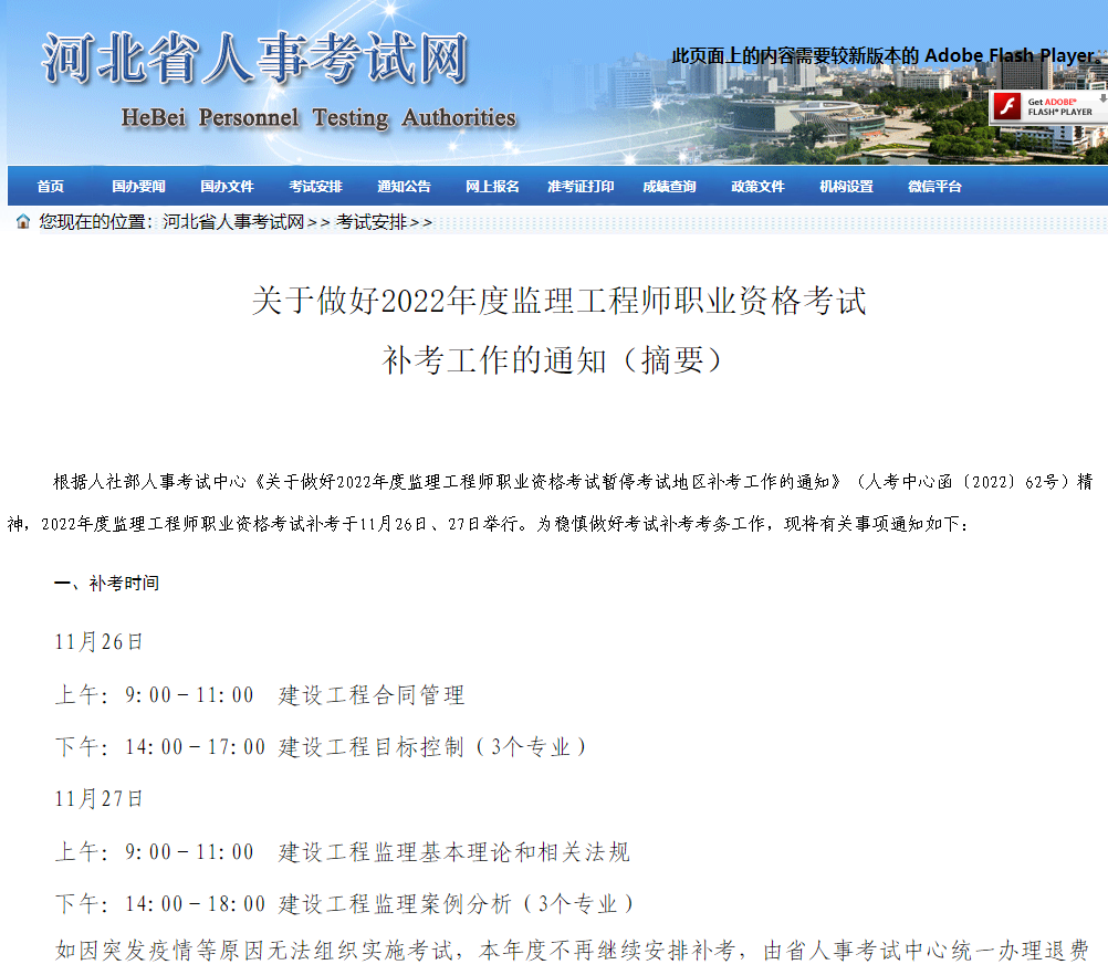 根据人社部人事考试中心《关于做好2022年度监理工程师职业资格考试暂停考试地区补考工作的通知》(人考中心函〔2022〕62号)精神,2022年度监理工程师职业资格考试补考于11月26日、27日举行。为稳慎做好考试补考考务工作,现将有关事项通知如下: