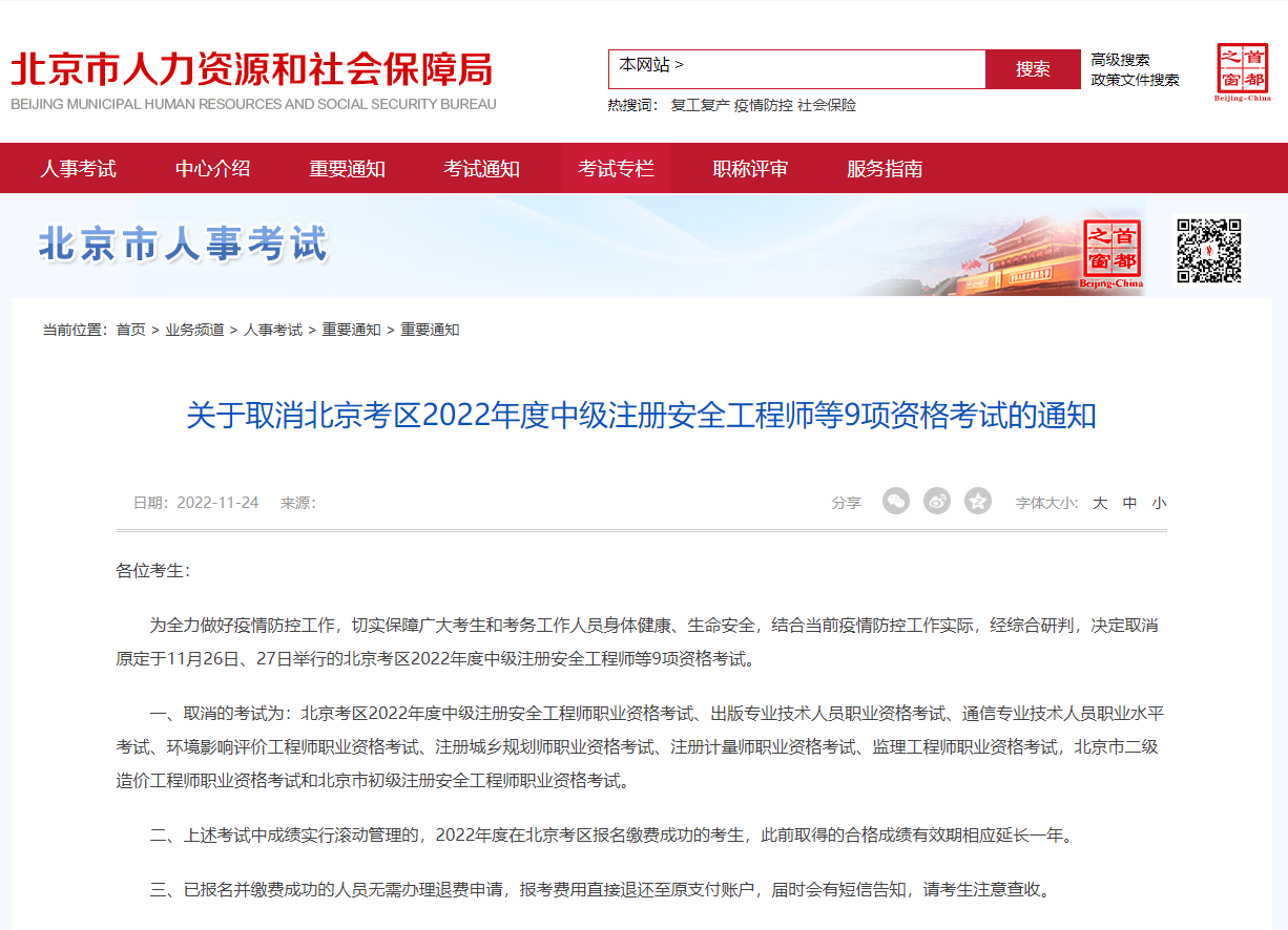 为全力做好疫情防控工作,切实保障广大考生和考务工作人员身体健康、生命安全,结合当前疫情防控工作实际,经综合研判,决定取消原定于11月26日、27日举行的北京考区2022年度中级注册安全工程师等9项资格考试。