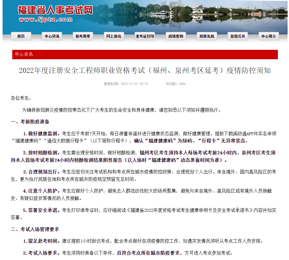 根据疫情防控要求,结合当前疫情形势,经研究,2022年度中级注册安全工程师职业资格考试泉州、福州考区考试时间调整至11月26、27日举行。