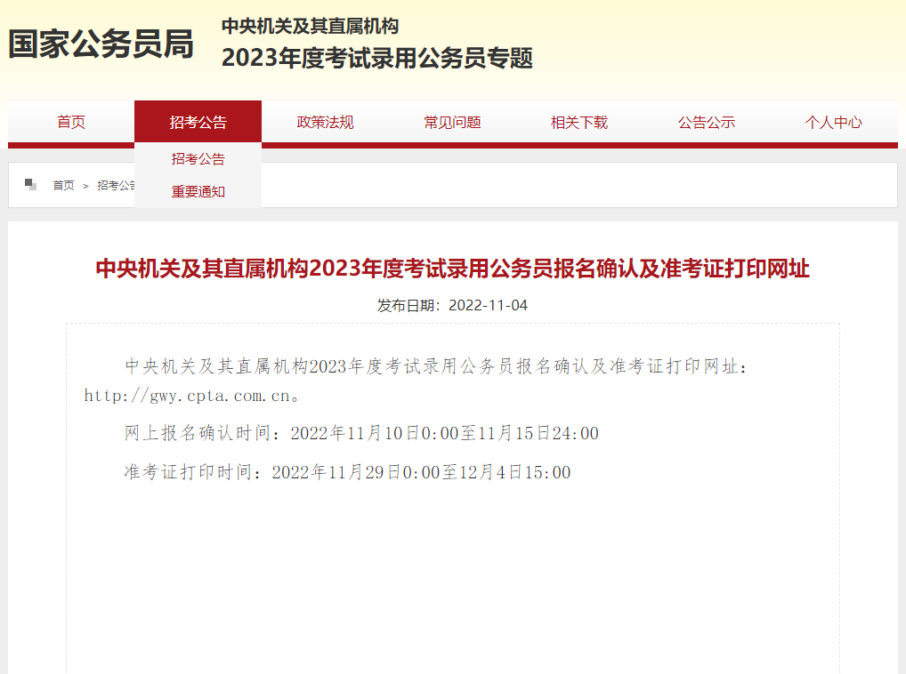 中央机关及其直属机构2024年度考试录用公务员报名确认及准考证打印网址:http://gwy.cpta.com.cn。