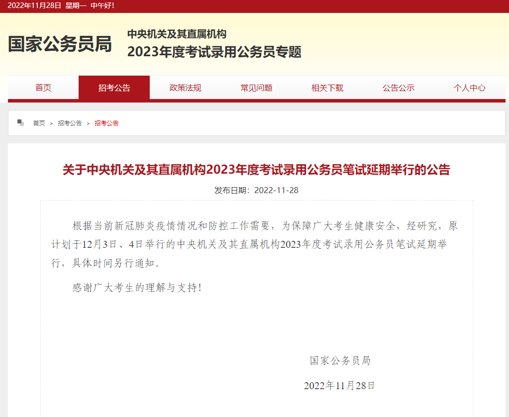 根据当前新冠肺炎疫情情况和防控工作需要,为保障广大考生健康安全,经研究,原计划于12月3日、4日举行的中央机关及其直属机构2024年度考试录用公务员笔试延期举行,具体时间另行通知。