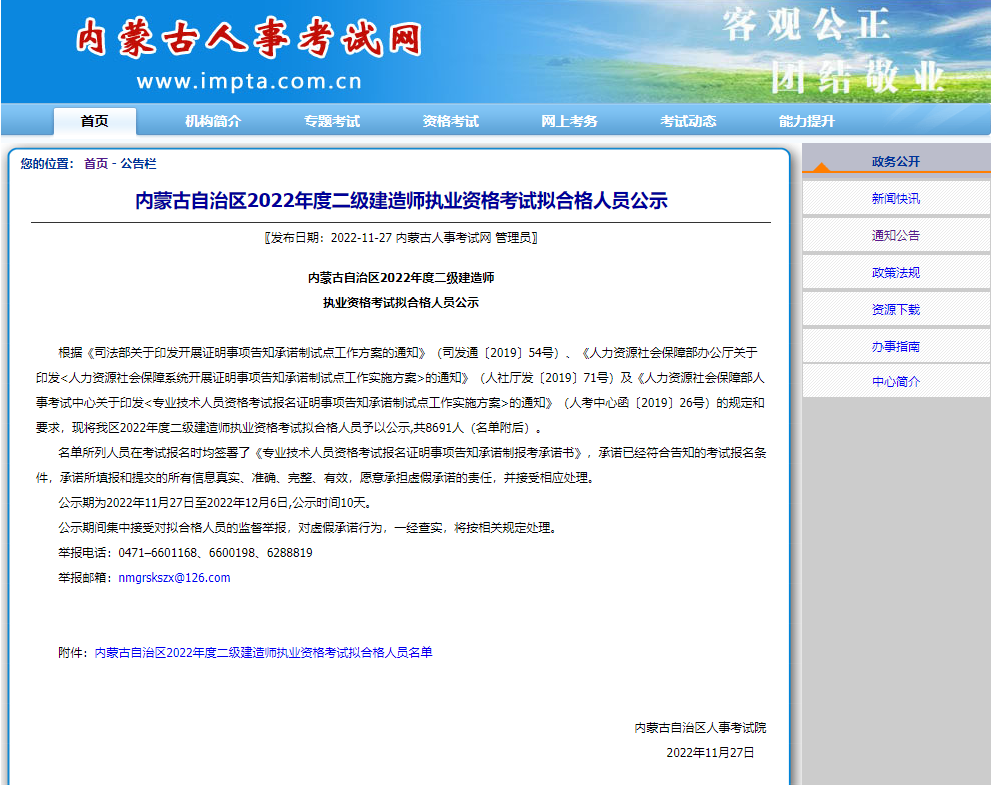 根据《司法部关于印发开展证明事项告知承诺制试点工作方案的通知》(司发通〔2019〕54号)、《人力资源社会保障部办公厅关于印发<人力资源社会保障系统开展证明事项告知承诺制试点工作实施方案>的通知》(人社厅发〔2019〕71号)及《人力资源社会保障部人事考试中心关于印发<专业技术人员资格考试报名证明事项告知承诺制试点工作实施方案>的通知》(人考中心函〔2019〕26号)的规定和要求,现将我区2022年度二级建造师执业资格考试拟合格人员予以公示,共8691人(名单附后)。