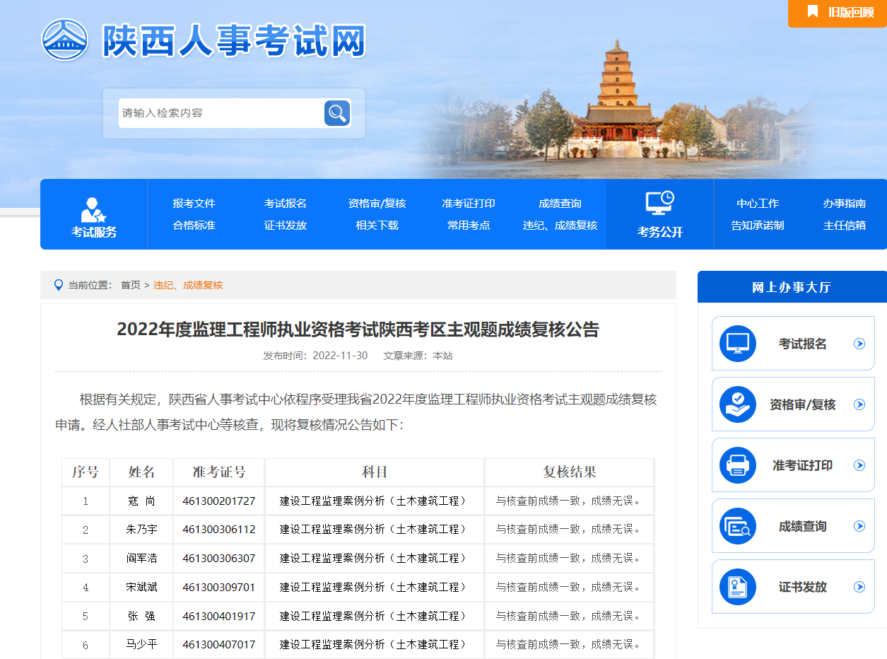 根据有关规定,陕西省人事考试中心依程序受理我省2022年度监理工程师执业资格考试主观题成绩复核申请。经人社部人事考试中心等核查,现将复核情况公告如下: