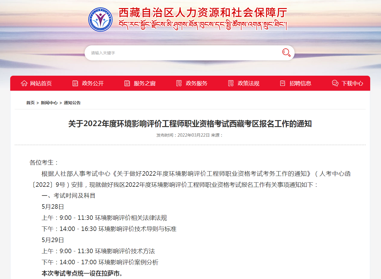 关于2022年度环境影响评价工程师职业资格考试西藏考区报名工作的通知
