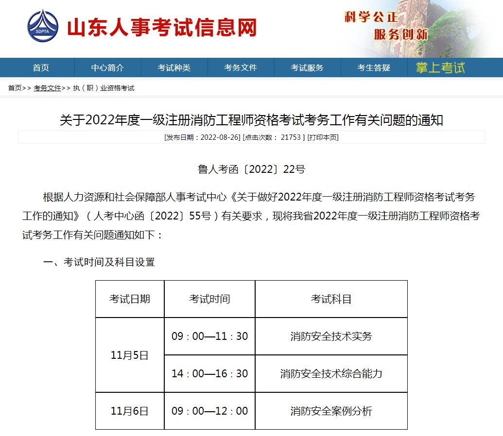 根据人力资源和社会保障部人事考试中心《关于做好2022年度一级注册消防工程师资格考试考务工作的通知》(人考中心函〔2022〕55号)有关要求,现将山东省2022年度一级注册消防工程师资格考试考务工作有关问题通知如下: