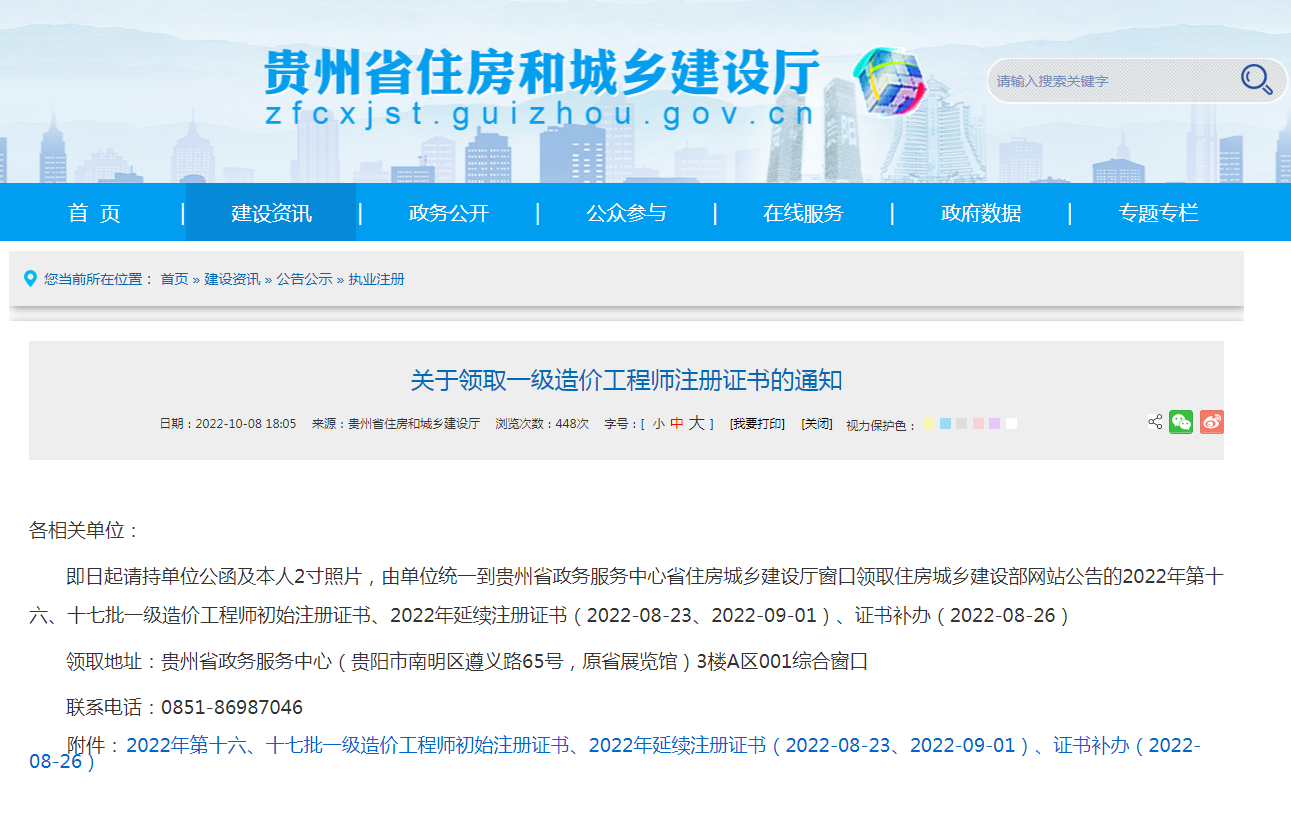 2022年10月8日起请持单位公函及本人2寸照片,由单位统一到贵州省政务服务中心省住房城乡建设厅窗口领取住房城乡建设部网站公告的2022年第十六、十七批一级造价工程师初始注册证书、2022年延续注册证书(2022-08-23、2022-09-01)、证书补办(2022-08-26)