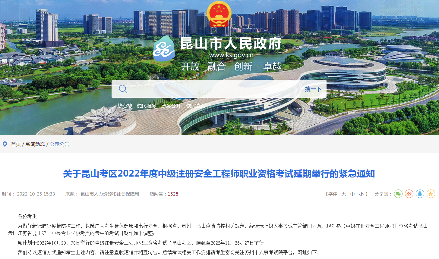 为做好新冠肺炎疫情防控工作,保障广大考生身体健康和出行安全,根据省、苏州、昆山疫情防控相关规定,经请示上级人事考试主管部门同意,现对参加中级注册安全工程师职业资格考试昆山考区江苏省昆山第一中等专业学校考点的考生的考试日期作如下调整: