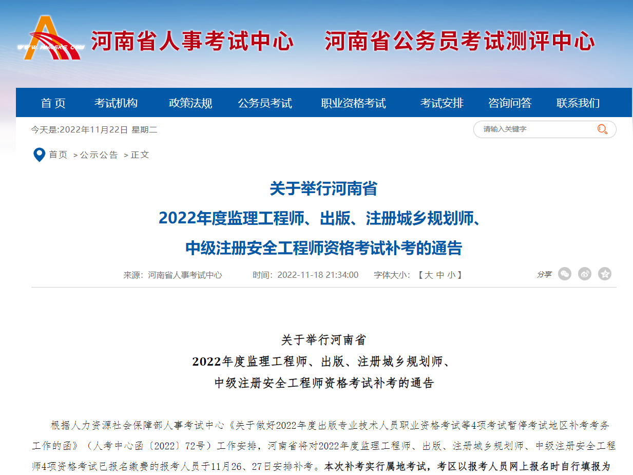 根据人力资源社会保障部人事考试中心《关于做好2022年度出版专业技术人员职业资格考试等4项考试暂停考试地区补考考务工作的函》(人考中心函〔2022〕72号)工作安排,河南省将对2022年度监理工程师、出版、注册城乡规划师、中级注册安全工程师4项资格考试已报名缴费的报考人员于11月26、27日安排补考。本次补考实行属地考试,考区以报考人员网上报名时自行填报为准。