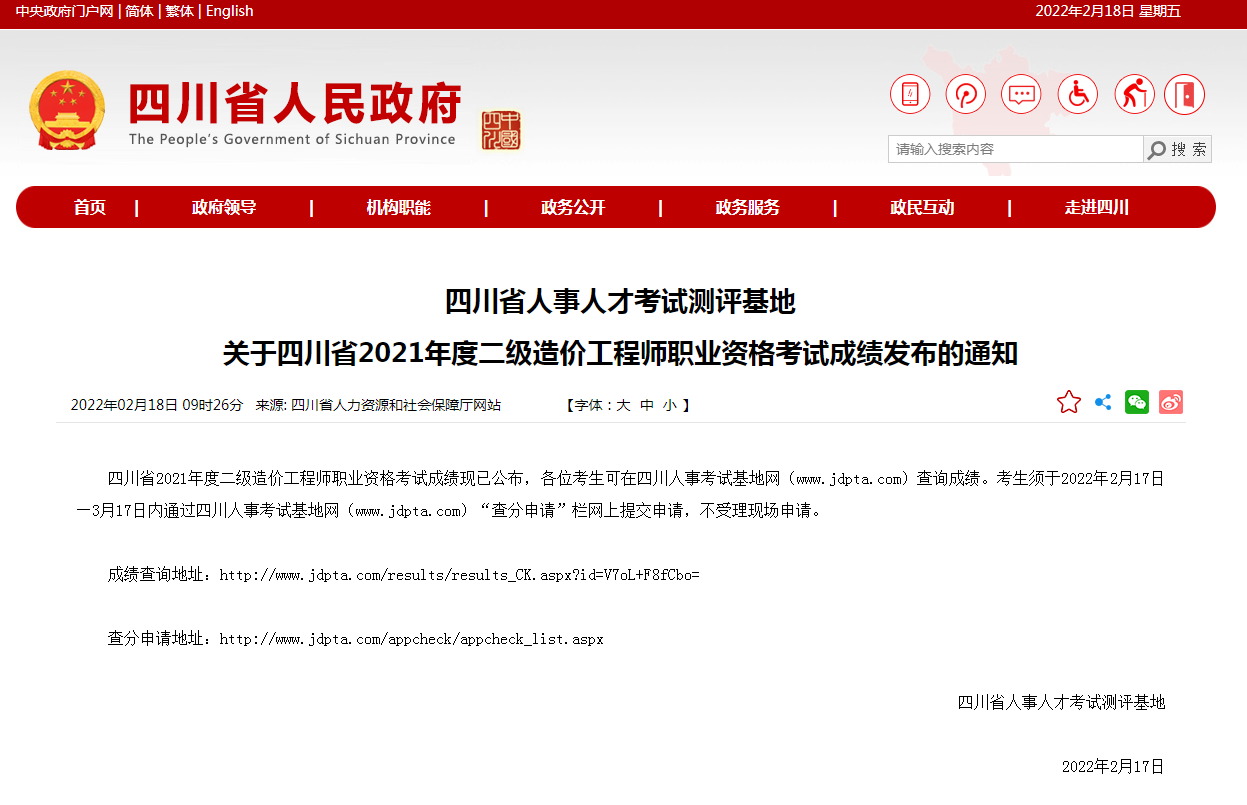 四川省2021年度二级造价工程师职业资格考试成绩现已公布,各位考生可在四川人事考试基地网(www.jdpta.com)查询成绩。考生须于2022年2月17日—3月17日内通过四川人事考试基地网(www.jdpta.com)“查分申请”栏网上提交申请,不受理现场申请。