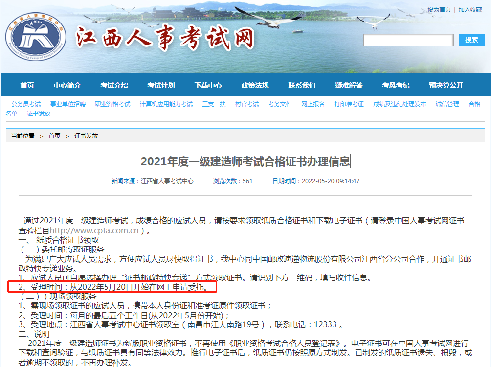 上考教育从江西人事考试网获悉,江西一级建造师2021年考试合格证书于5月20日开始接受申领,没有特殊情况下都是邮政快递,请各位考生及时的到官网进行领取,电子和纸质的都是可以的,以下就是关于这次公告的详细情况: