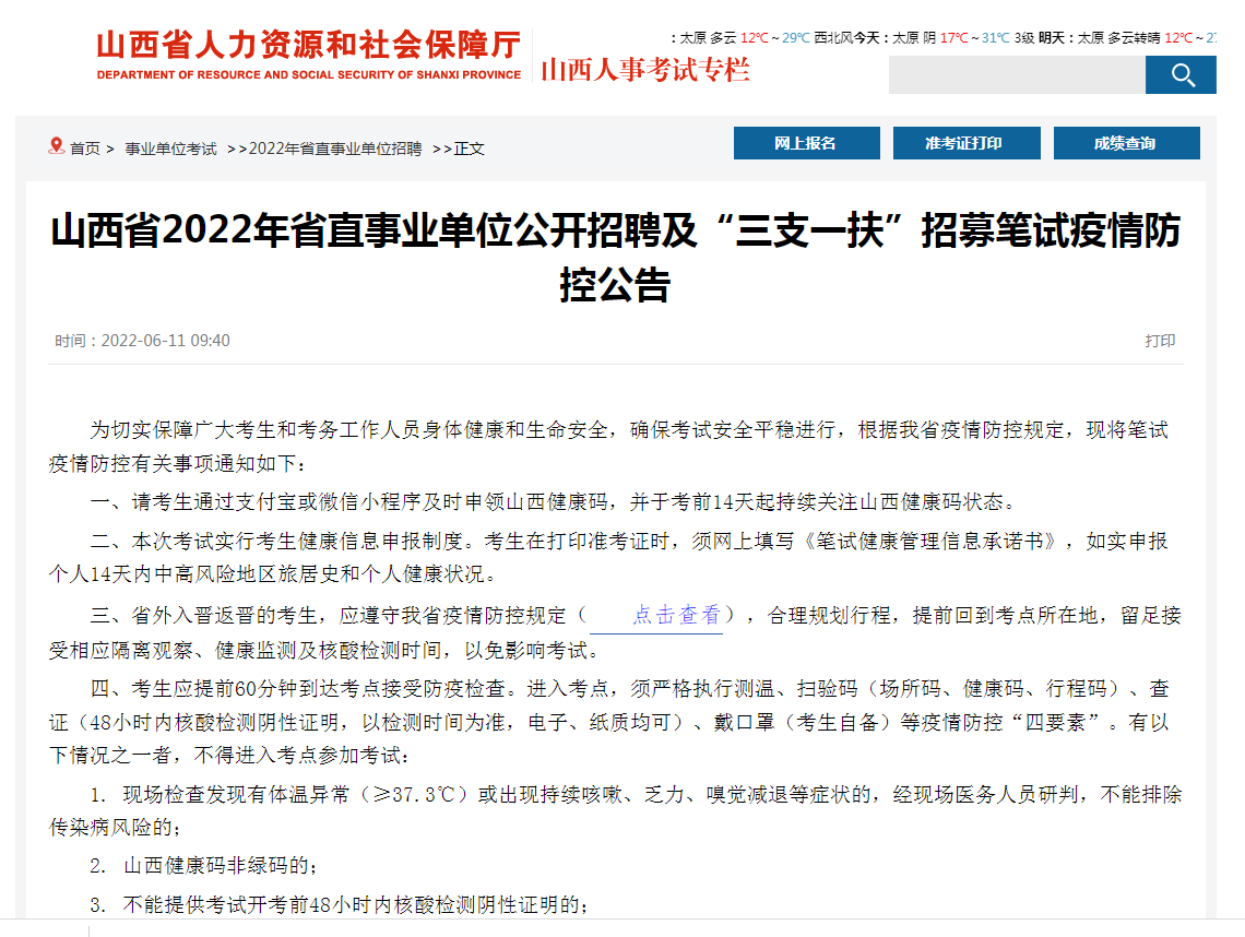 五、根据国家及山西省疫情防控动态规定,必要时将对笔试有关工作安排进行适当调整。请考生随时关注山西人事考试专栏,自觉遵守相关要求,做好参加笔试准备。