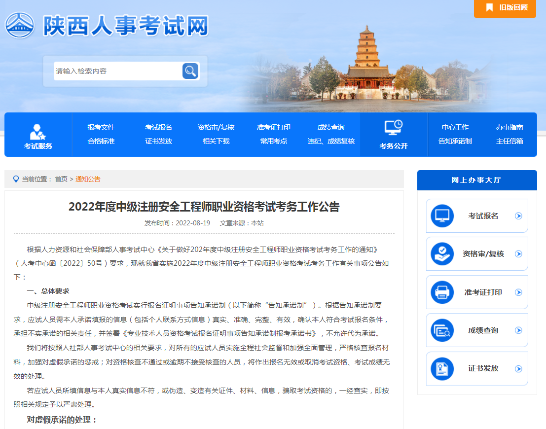 根据人力资源和社会保障部人事考试中心《关于做好202年度中级注册安全工程师职业资格考试考务工作的通知》(人考中心函〔2022〕50号)要求,现就陕西省实施2022年度中级注册安全工程师职业资格考试考务工作有关事项公告如下: