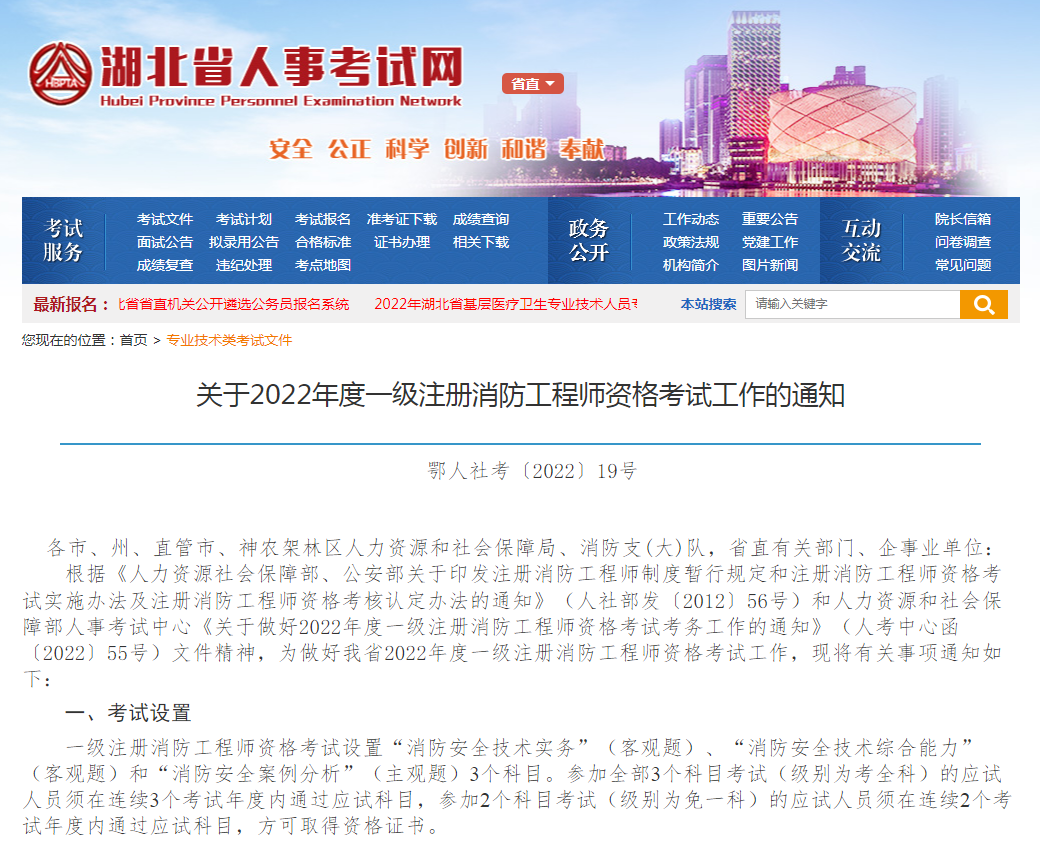 根据《人力资源社会保障部、公安部关于印发注册消防工程师制度暂行规定和注册消防工程师资格考试实施办法及注册消防工程师资格考核认定办法的通知》(人社部发〔2012〕56号)和人力资源和社会保障部人事考试中心《关于做好2022年度一级注册消防工程师资格考试考务工作的通知》(人考中心函〔2022〕55号)文件精神,为做好我省2022年度一级注册消防工程师资格考试工作,现将有关事项通知如下: