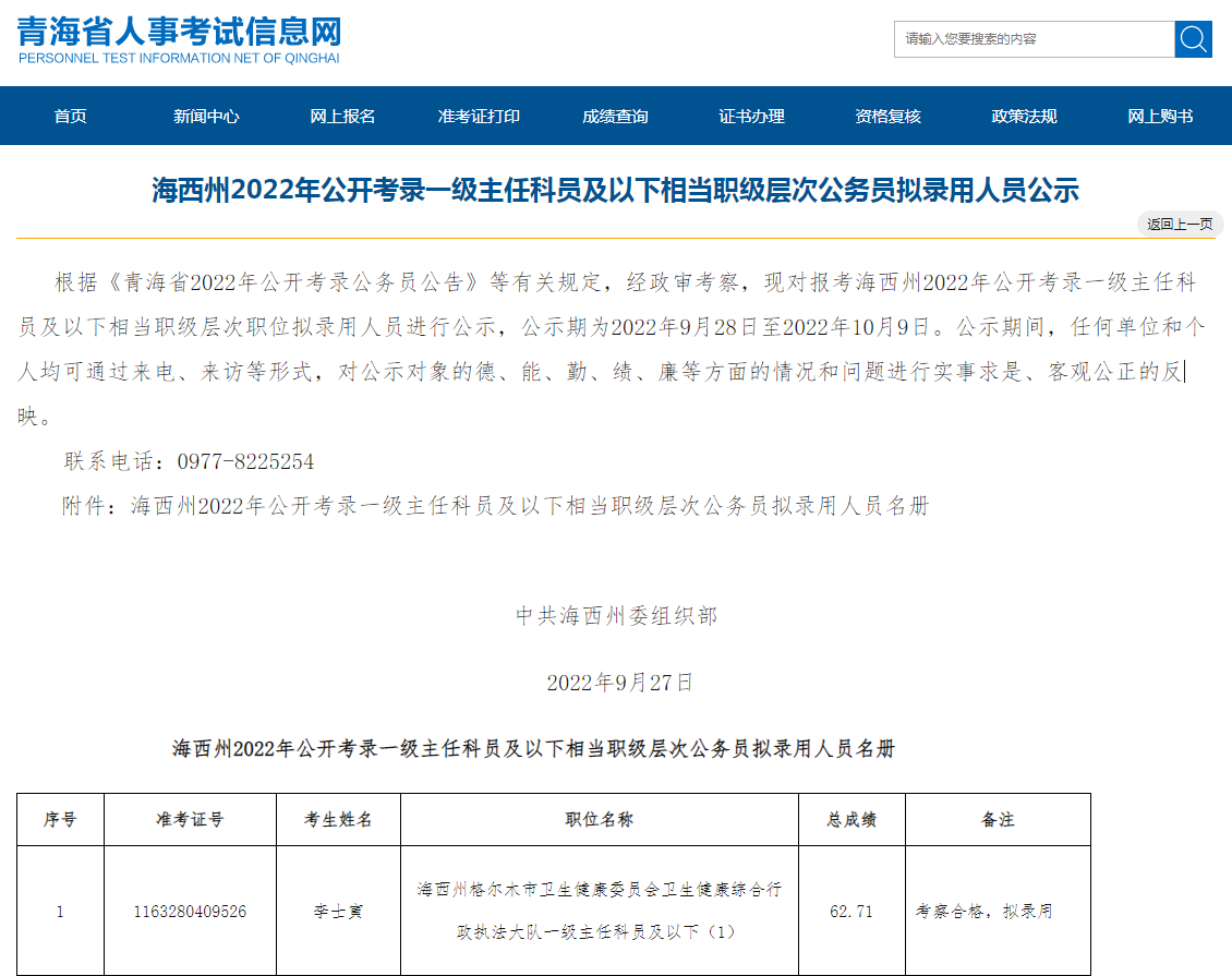 根据《青海省2022年公开考录公务员公告》等有关规定,经政审考察,现对报考海西州2022年公开考录一级主任科员及以下相当职级层次职位拟录用人员进行公示,公示期为2022年9月28日至2022年10月9日。公示期间,任何单位和个人均可通过来电、来访等形式,对公示对象的德、能、勤、绩、廉等方面的情况和问题进行实事求是、客观公正的反映。