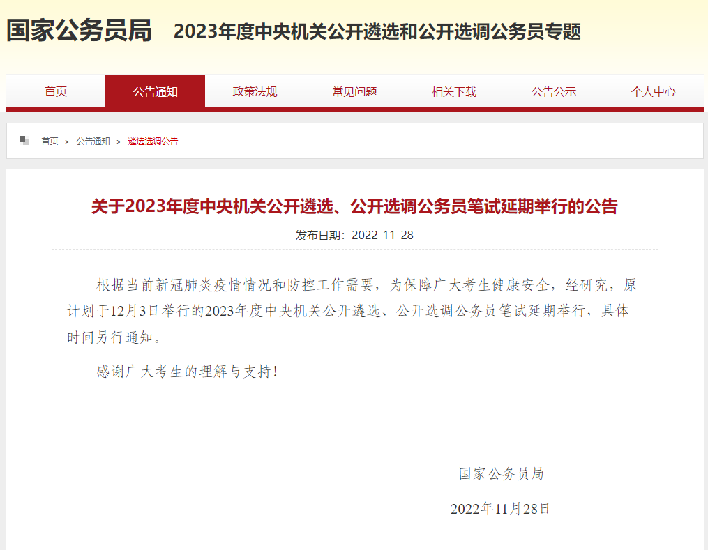 根据当前新冠肺炎疫情情况和防控工作需要,为保障广大考生健康安全,经研究,原计划于12月3日举行的2024年度中央机关公开遴选、公开选调公务员笔试延期举行,具体时间另行通知。