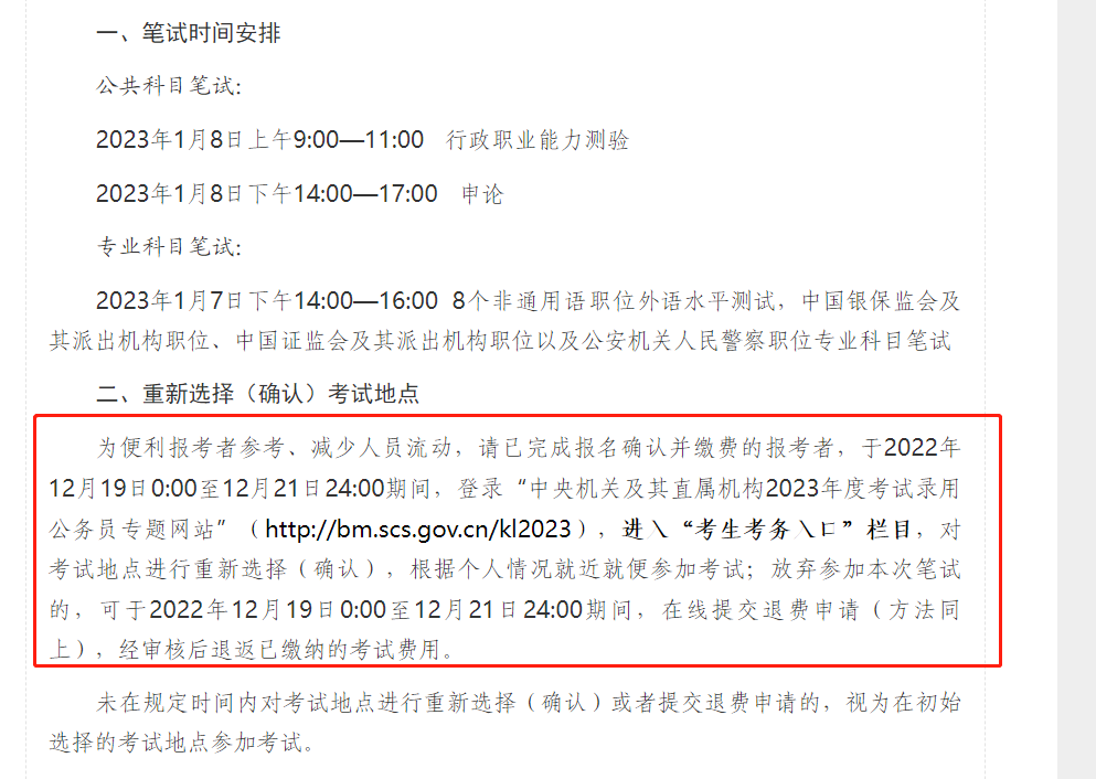 为便利报考者参考、减少人员流动,请已完成报名确认并缴费的报考者,于2022年12月19日0:00至12月21日24:00期间,登录“中央机关及其直属机构2024年度考试录用公务员专题网站”(http://bm.scs.gov.cn/kl2024),进入“考生考务入口”栏目,对考试地点进行重新选择(确认),根据个人情况就近就便参加考试;放弃参加本次笔试的,可于2022年12月19日0:00至12月21日24:00期间,在线提交退费申请(方法同上),经审核后退返已缴纳的考试费用。